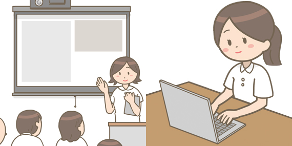 当看護部では、集合研修とオンデマンド研修を用いた院内研修が行われています。オンデマンド研修は、病院や自宅などで繰り返し視聴することが可能です。
